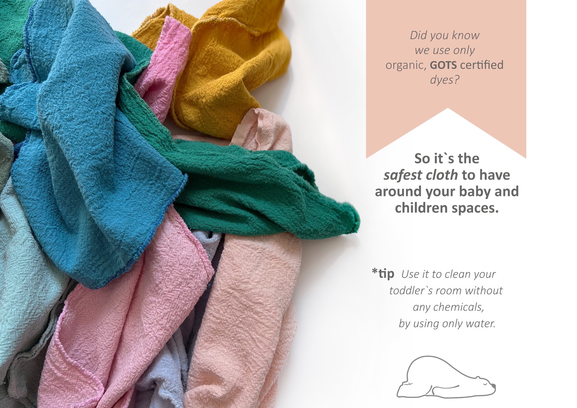 - the beautiful bright colors that we make by using only organic, GOTS certified dyes, which means it's extremely safe around food areas and children spaces